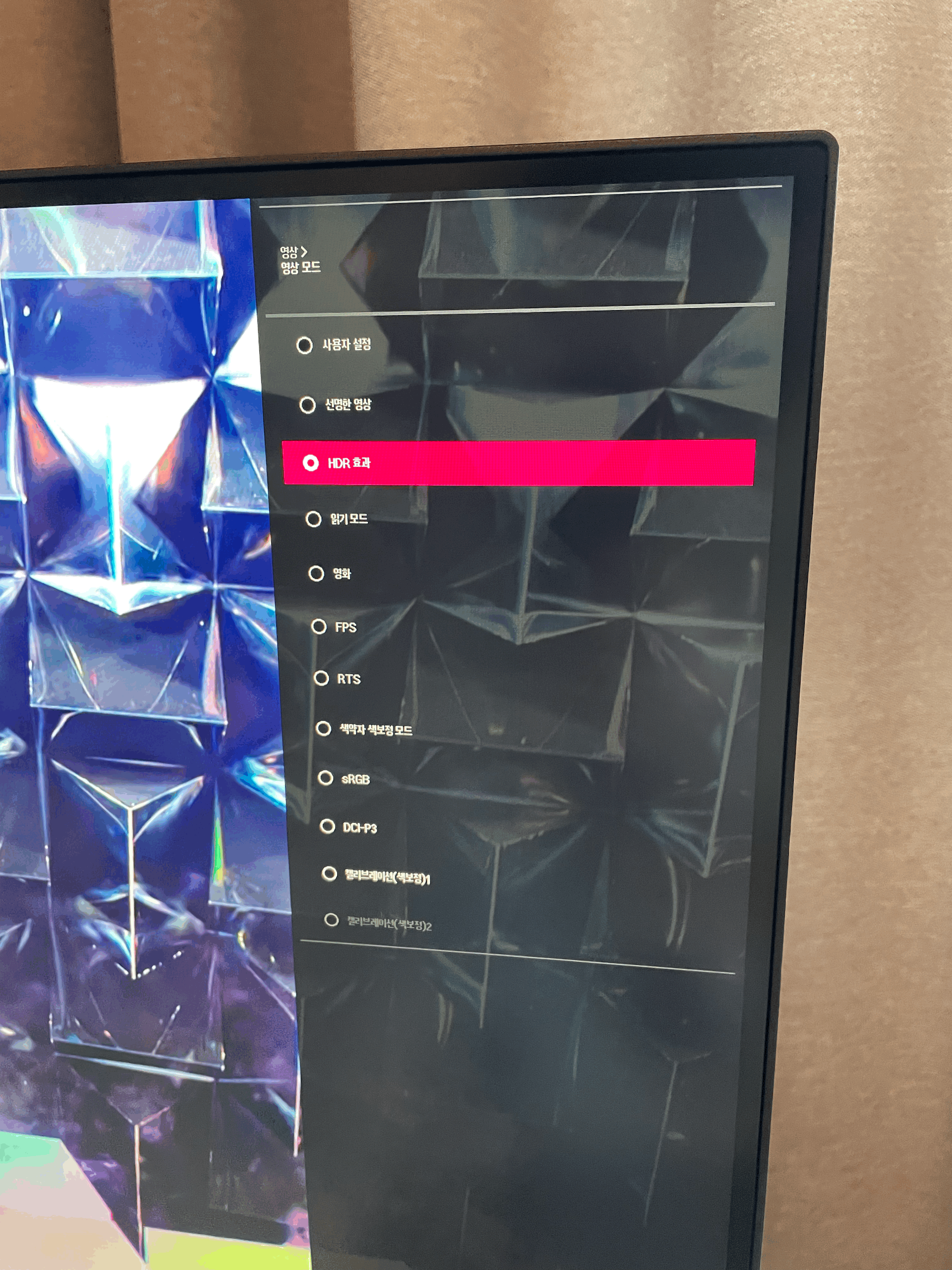 - HDR효과는 설정 > 영상모드 에서 할 수 있으며 평소 작업, 코딩을 할 때는 읽기모드로 두고 사용하며 영상물을 볼떄에는 HDR효과로 선택해서 보고 있다.